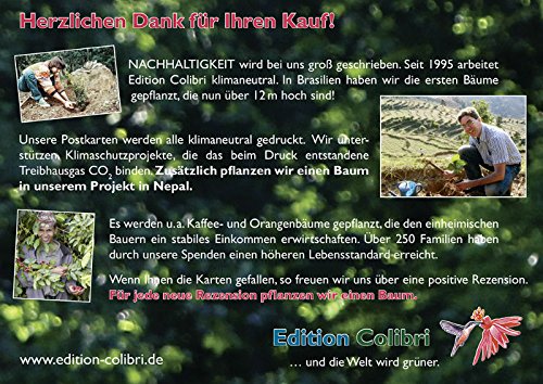100 Christmas cards made in small quantities in Germany. ECOLOGICAL - Our prints are produced in a climate-neutral way, which means we support climate projects to offset the carbon footprint. As a thank you for purchasing our card sets, we plant a tree as part of our project in Nepal. Since 2010, the Edition Colibri company and its founder Jörg Drews have been involved in Nepal and regularly donate to the association "Nepalhilfe Aachen eV". This uses our donations exclusively and entirely to finance the "One Million Trees for Nepal" project, which has been recognized by the UNEP (United Nations Environmental Program).